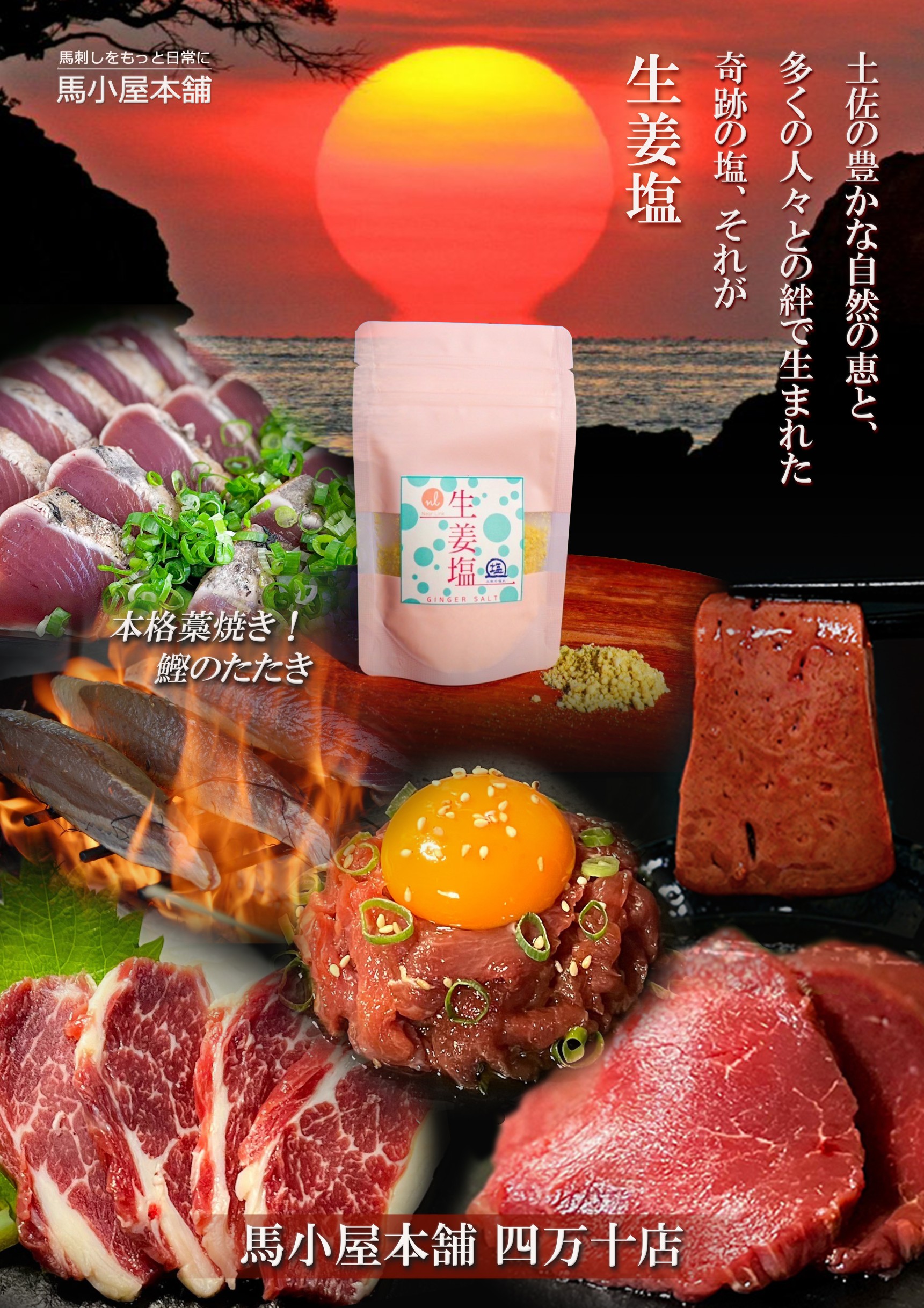 四万十店ではハーブ馬肉をはじめ、地元民激推しの「本格藁焼き 鰹のたたき」や、高知の生姜農家さんを助けたい!そんな想いから、高知の天日塩と生姜を合わせて誕生した奇跡の塩「生姜塩」を取り扱っております。
